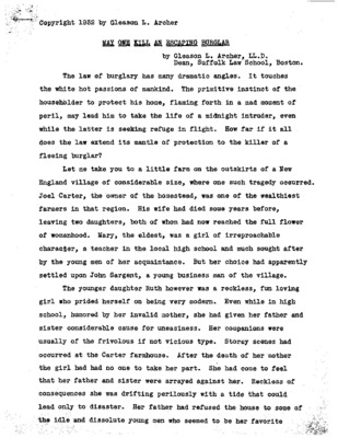 Radio transcript: "May one kill an escaping burglar?" by Gleason L. Archer, 1932