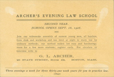 Unknown, "Archer's Evening Law School advertisement, circa 1906" (1906). Gleason Leonard Archer Images and Memorabilia. 18.