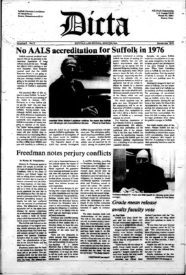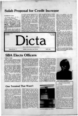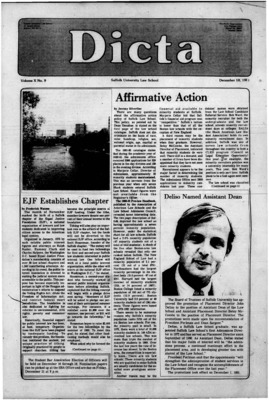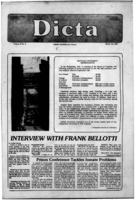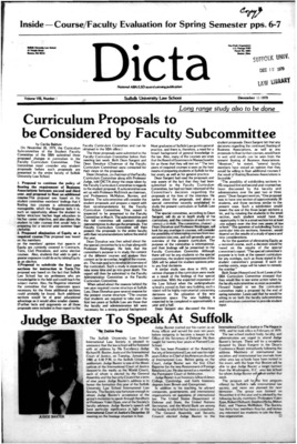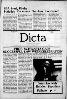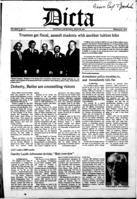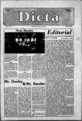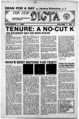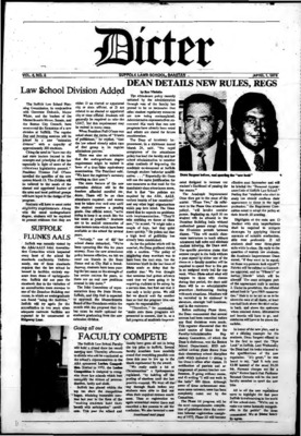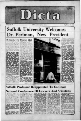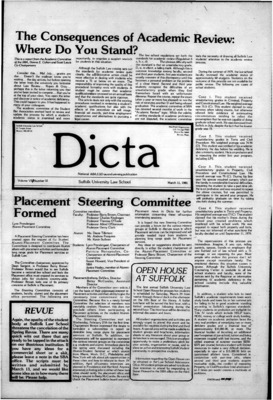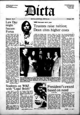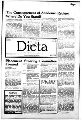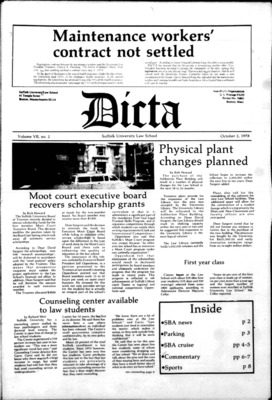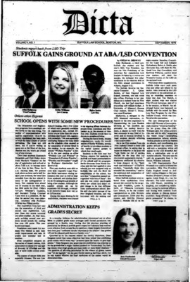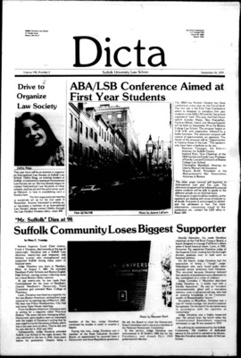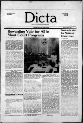 Dicta, the student newspaper of Suffolk University Law School, was published from 1972-2017. The name briefly changed to Suffolk University Law School paper from 2005-2006, it then changed back to Dicta after April 2006. The number of issues published per year varies.