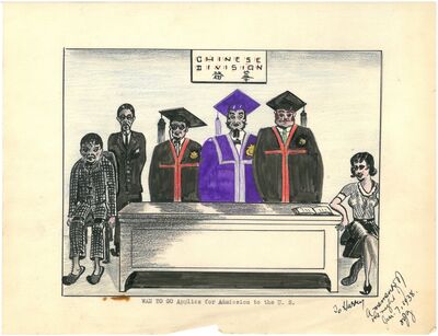 Hand drawn illustration of a scene from a play written by Harry Hom Dow about the review of a case in the United States Immigration and Naturalization Service in which the applicant, a Chinese man played by Dow, is denied admission to the United States after being caught with a "coaching document." The caption at the bottom of the drawing reads, "Wan To Go applies for admission to the U.S.," and the inscription reads, "To Harry, a memento of the night Jan. 7, 1938, [signature indiscernible]"