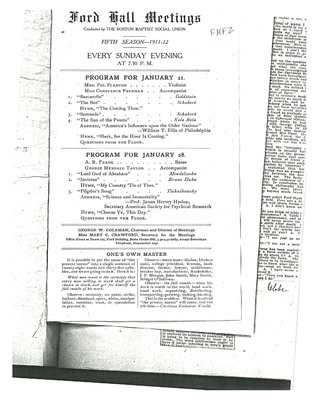 Pamphlet announcing the opening of the 29th season, 1936-1937, of the Ford Hall Forum. "Advance Announcement" written on front cover. Season line up includes Ernst Toller, S. Miles Bouton, John Spivak, Bertrand Russell, Norman Thomas, Herbert Agar, John T. Flynn, Constantine A. Oumansky, Emil Ludwig, Lord Marley, Salvador de Madariaga, Vito Marcantonio, Smedley D. Butler, Arthur Willert, Dorothea Brande, Ernest Dimnet, Gerhart Segar, Jennie Lee, Erskine Caldwell, Alfred Adler, Shidzue Ishimoto, Harry A. Overstreet, Langston Hughes, Raoul de Sales, Helgo W. Culemann, John Hayes Holmes, Harold J. Laski, and Alexander Meiklejohn. Pamphlet also lists adult education activities including Our Little Theatre, Dance Group, Discussion Group, Classes in English, German, and Russian, the Youth Forum, and the Ford Hall Forum Town Meetings.