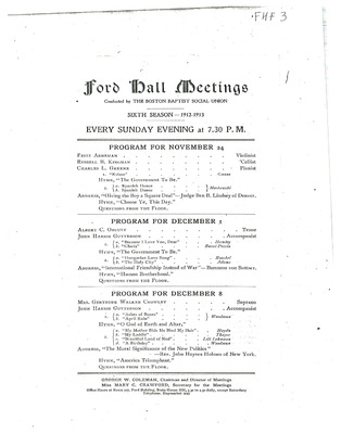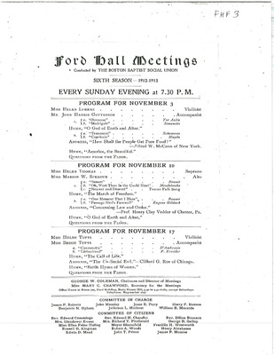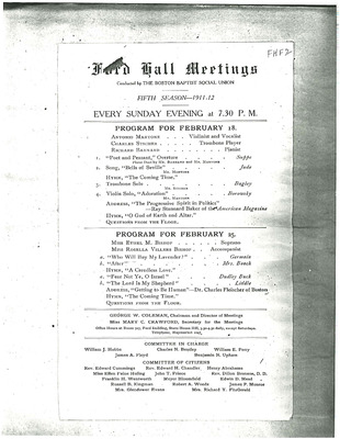 Pamphlet announcing the opening of the 32nd season, 1939-1940, of the Ford Hall Forum. "Advance Announcement" printed on front cover. Season line up includes Vincent Sheean, Rabbi Joshua Loth Liebman, William Patrick Hitler, Stephen S. Wise, Ernest Dimnet, Herbert Agar, Professor Mortiz J. Bonn, Max Lerner, Louis Fischer, Hamilton Fish, Norman Thomas, Michael Williams, Louis K. Anspacher, Pierre Van Paassen, Maurice Hindus, Reverend Father E.F. Murphy, Harry Gideonse, T.V. Smith, Professor Harry Overstreet, Lewis Browne, Mortimer J. Adler, John Haynes Holmes. Pamphlet also lists adult education activities including the Ford Hall Forum Players, Dance Group, Course in Music Appreciation, and the Youth Forum.