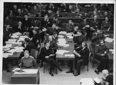 View of the courtroom at a proceeding of the Nuremberg Trial, 1946