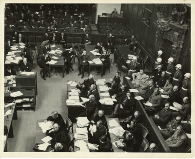 Overhead view of the Nuremberg trial of Martin Boerhman, photograph, 1946
